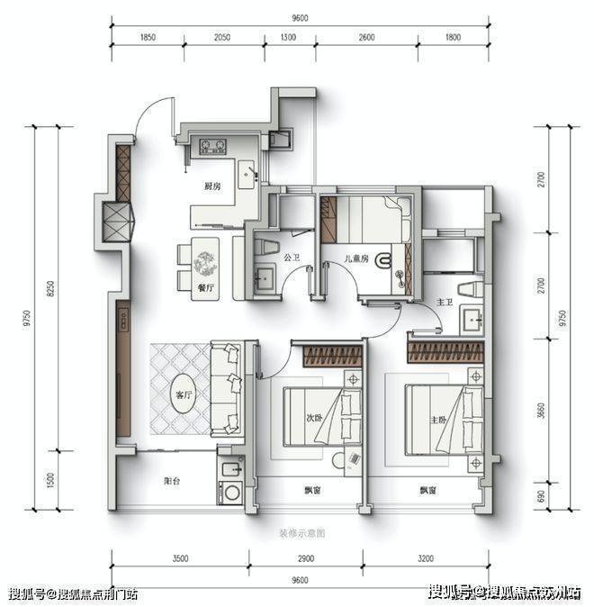 三房两厅两卫设计,三开间朝南,南向开间将近10米,客厅还连通了进深约1.5米的大阳台。