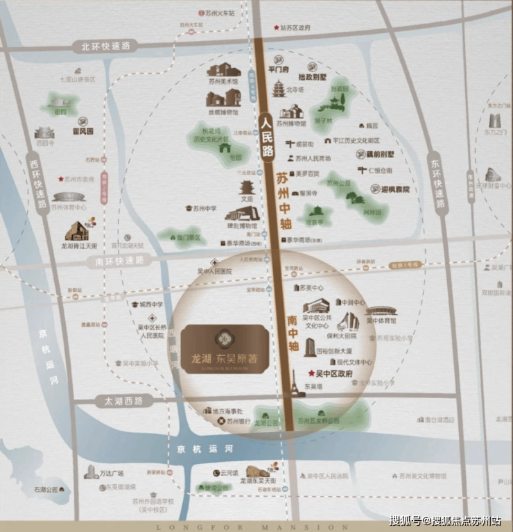 龙湖东吴原著落子吴中经开区长桥街道太湖西路北侧、西塘河东侧,地处吴中老城核心区,与吴中区政府隔街相望。