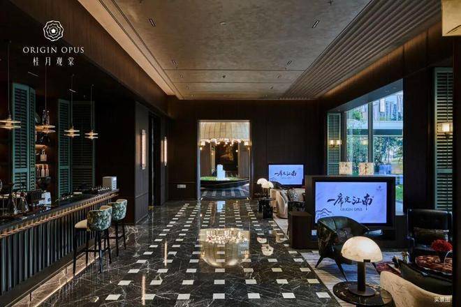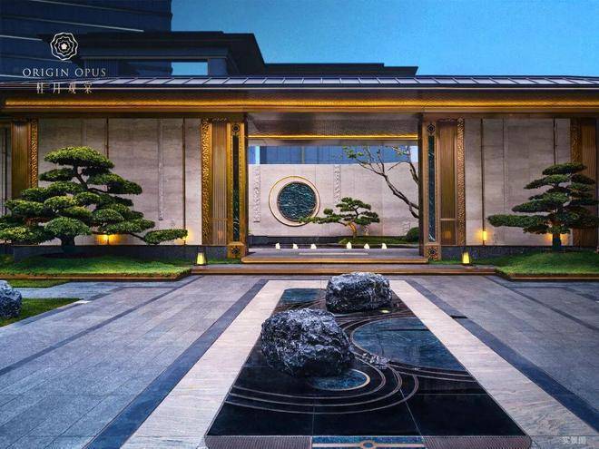 月影江南 灵韵入境:入户两侧水景清泉涌动,婉转迂回,一座精致的宋风美学馆展示在眼前。透过门框衬映出满月景墙,甄选名贵奢石,在虚实掩映间延续着东方诗意山水的写意画卷。