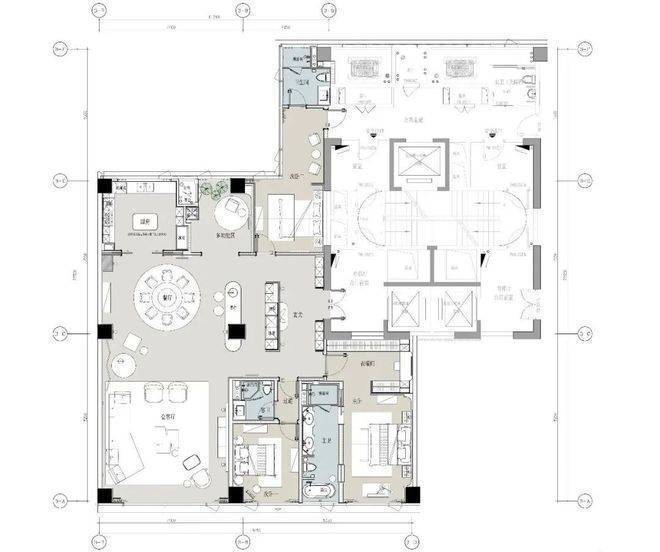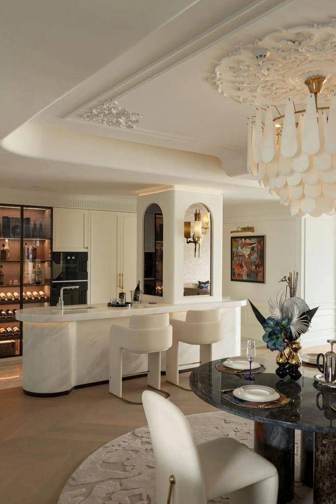 中间套的客餐厅更是达到约100㎡,一张12人的大圆桌也有充足的空间优雅转身。周末约上好友来聚会,给主人赚够了颜面。