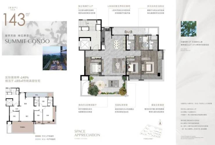 建面约143㎡洋房(赠送约29㎡露台,使用面积相当于约185㎡传统高层)