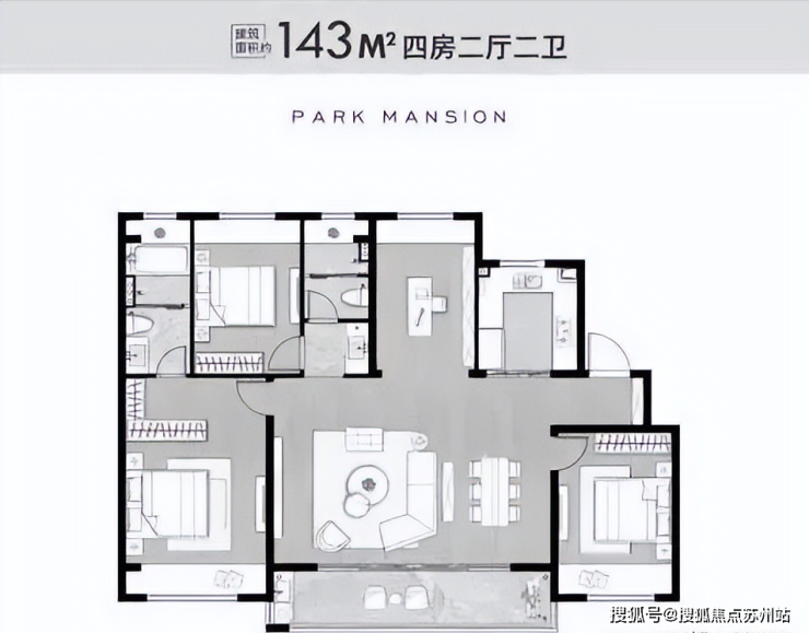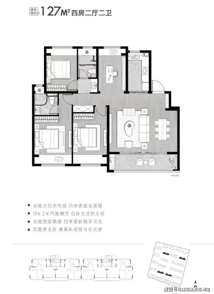 因户型面积的限制,127平做四房略显局促,户型胜在横厅双阳台。