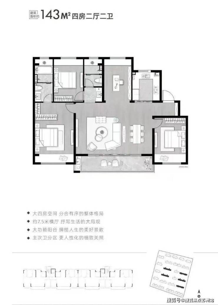 约7.5米的大横厅很耀眼,是个尺度不一般的户型;可以称得上4开间朝南,主卧为大套房;所有卧室都有飘窗,全屋6个飘窗,得房率赞赞的;非常适合三胎家庭。