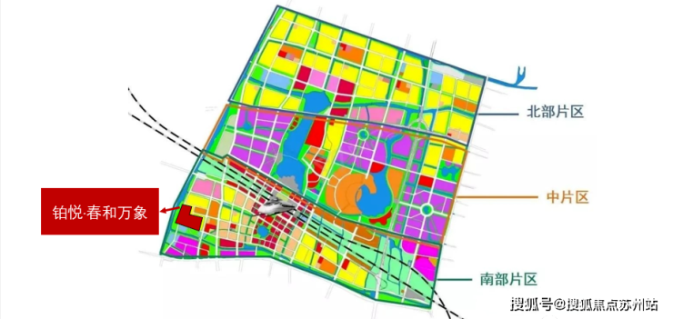 高铁新城以苏州北站为中心,产业以科技研发、科技金融、文化创意为支柱,片区规划是由南向北逐步开发,分为南-中-北三块区域