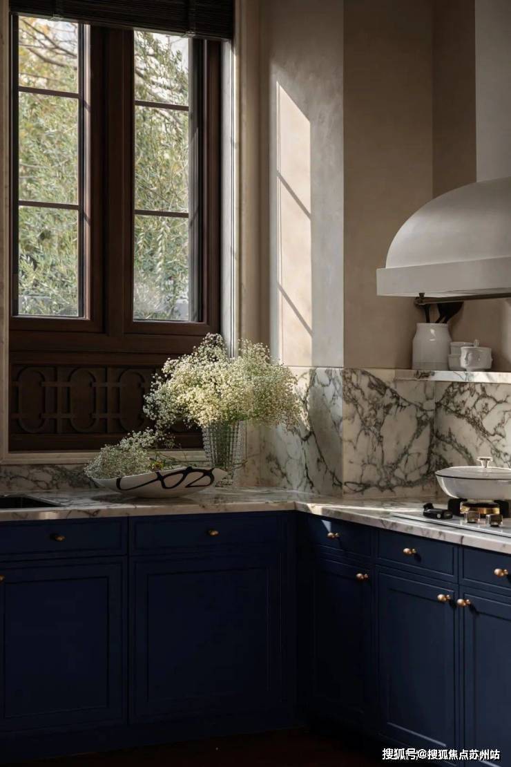 沉浸在这间厨房的深邃蓝色调中,它如同一位优雅的调色师,巧妙地与大理石台面相融合,营造出一种既大气又稳重的氛围。想象一下,当阳光透过窗户洒在室内,室外的花园景色与室内空间无缝连接,你在这里举办一场悠闲的下午茶或烧烤聚会。这样的生活,仿佛让时间慢了下来,让人沉醉于这份宁静与美好之中。
