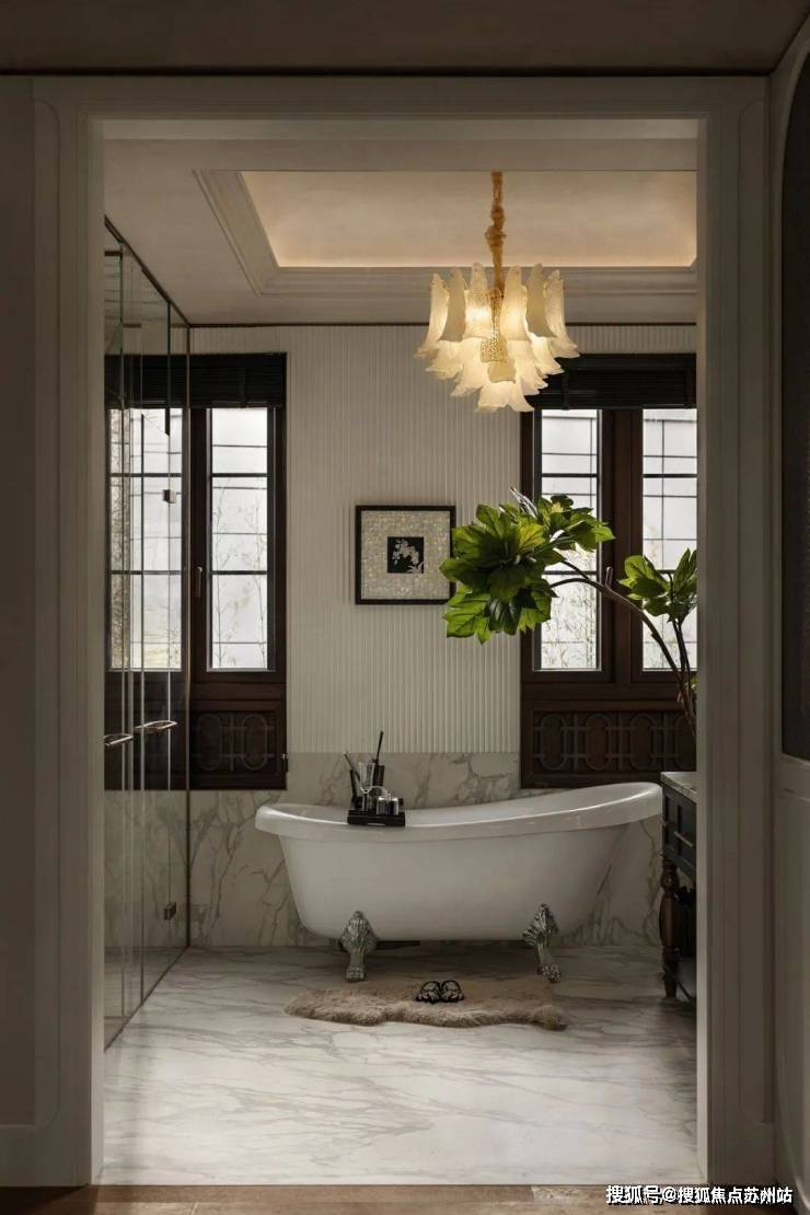 在热带植物的衬托下,浴室多了一抹明媚的自然气息,螺钿艺术画在光影中散发着斑斓的色彩,奢华无需多余的赘述。