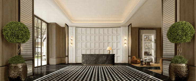 归家大堂层高约6米,融合传统门庭规制与现代酒店仪式,营造极具尊贵感的归家体验。