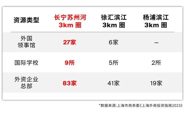 据上海市商务委《上海外商投资指南2023》数据显示,长宁涉外资源密度是徐汇滨江的2-3倍、杨浦滨江的4-10倍,是能够支撑国际客群支付溢价的!