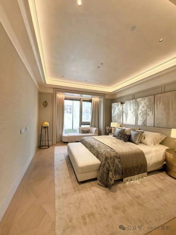 行政级主卧套房:双开门仪式感,超尺度空间,配置独立衣帽间、双台盆卫浴(浴缸+淋浴)、类酒店MiniBar及私享客厅,休憩、社交、观景功能完备.