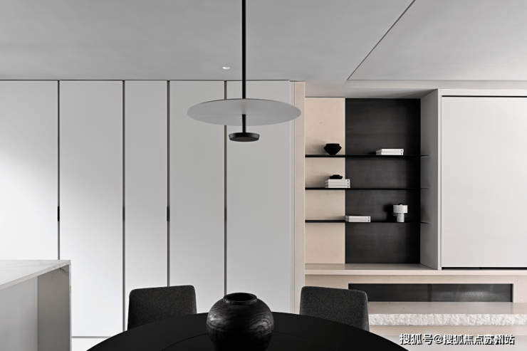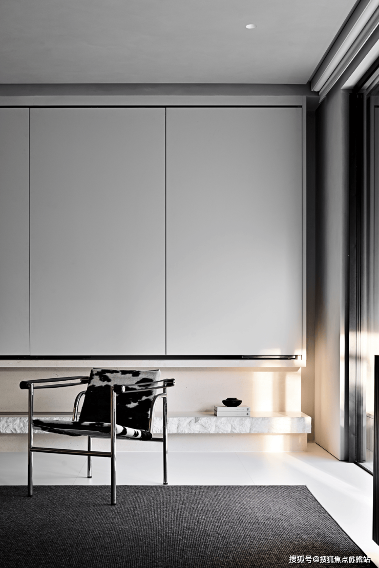 书房被藏在墙面的木色隐形门内,隐形门巧妙地在客厅与书房之间作了缓冲,避免白色“重叠”而造成疲劳感.