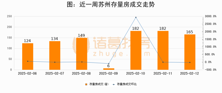从存量房来看,2025年02月12日苏州存量房单日成交165套,比昨日减少17套,环比下降9.3%。从近一周存量房成交来看,苏州存量房日均成交套数为134套,02月12日单日成交165套,高于近一周平均水平23.1%。