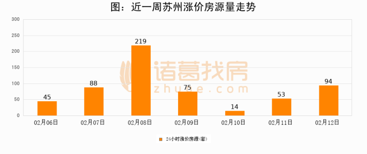 根据诸葛找房数据显示,苏州24小时涨价房源量为94套,较02月11日增加41套,环比上涨77.4%。与此同时,涨价房源占比小幅扩大,业主信心有所提升。