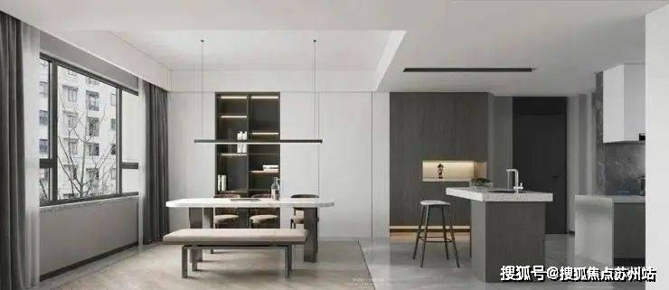 客餐厅一体化,让空间更加通透大气,水吧顶面设计出风口,空间更有现代感