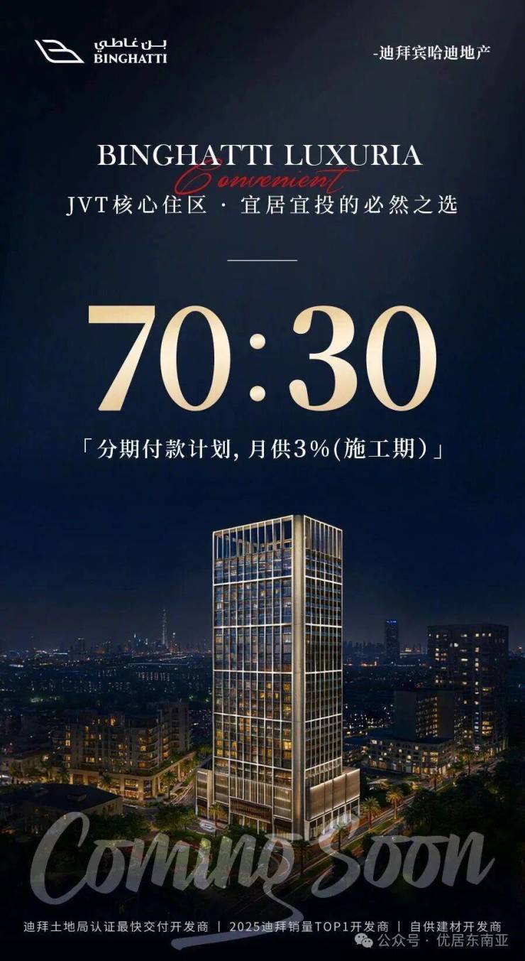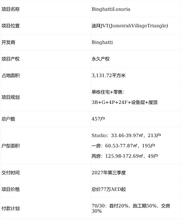 迪拜房地产市场持续稳定增长,JVT区域的公寓价格在过去两年上涨了约30%。作为一个期房项目(预计2027年Q3交付),BinghattiLuxuria在完工前具有巨大的资本增值潜力。