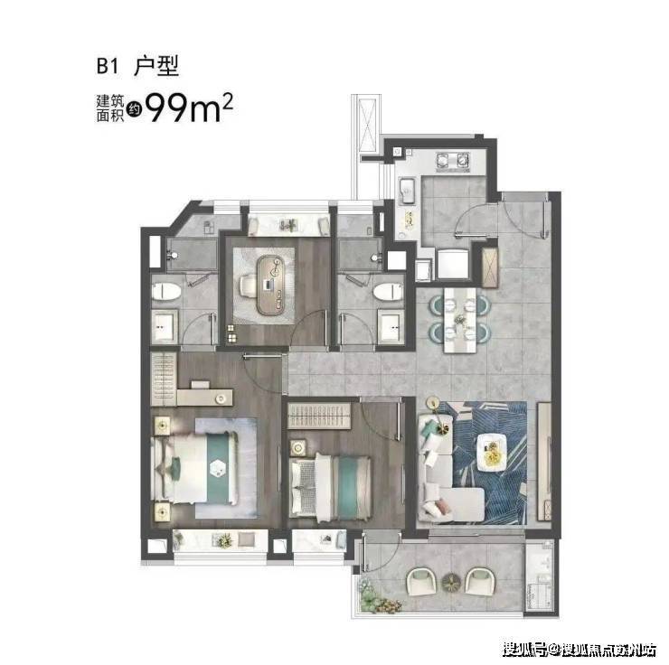建面约99㎡3房户型图▼