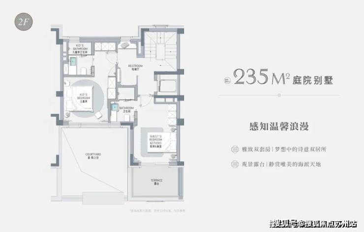 以建面约235㎡的庭院别墅样板房为例,户型附赠地下室、庭院、露台、阁楼空间,附赠面积达到户型总建面的60%左右,市场上少之又少!