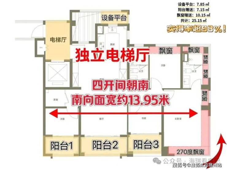 类一梯一户的独立电梯厅+约13.95米南向大面宽+三阳台和设备平台的超高实得率+270度全景舱视野+超高效收纳,实得率超93%!