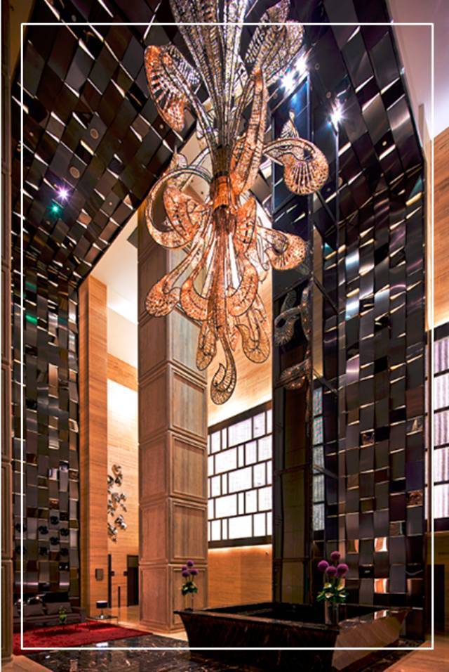上海天玺迎客大堂挑高达18.5米,大气之至,登峰造极,大堂中的巨型定制水晶灯闪耀着迷人的灯光,营造无与伦比的奢华感。