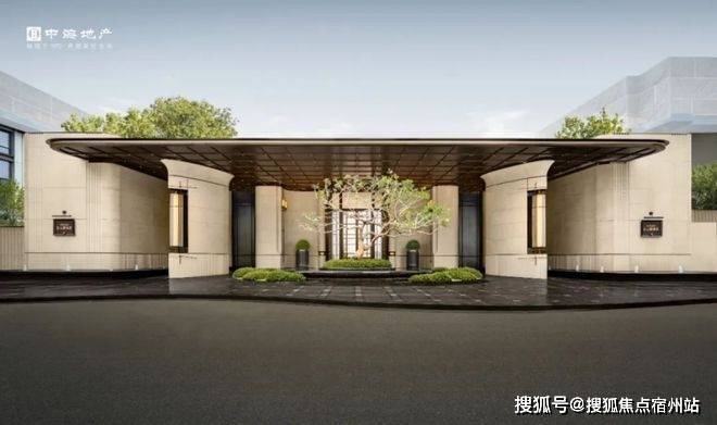 项目的主入口,门头承袭玖字理念,约55m横向尺度与约7m纵向高度,高于传统的约4m高景墙,搭配通高陈列的全石材柱体,恭迎业主归家。