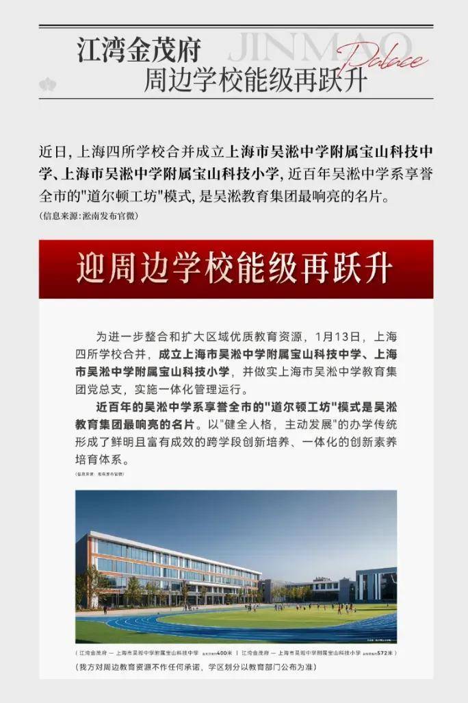 当板块内的教育资源通过战略合并与整合实现能级跃升,其带来的不仅是教育选择的优化,更是区域价值的深层加固。优质学校的聚集,始终是资产穿越周期最坚实的保障,为社区提供着持续而稳定的内生动力。上海四所学校合并成上海市吴淞中学附属宝山科技中学、上海市吴淞中学附属宝山科技小学两所重点学校,这将为江湾金茂府的未来价值提供重要支撑。
