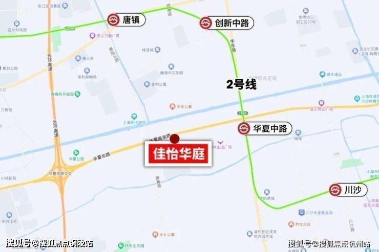 佳怡华庭项目位于川沙和唐镇交界处,和唐镇仅相隔一条华夏东路,距离2号线华夏东路站约1.3km。