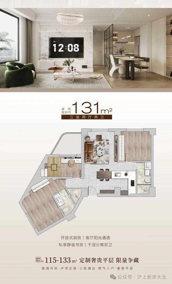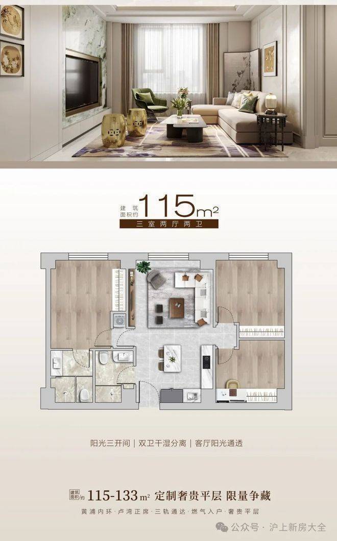黄浦·滨湾黄浦卢湾板块,通燃气大平层,115-133平奢装三房,鲁班路地铁口,3条地铁线,4梯6户,600万起买黄浦核芯