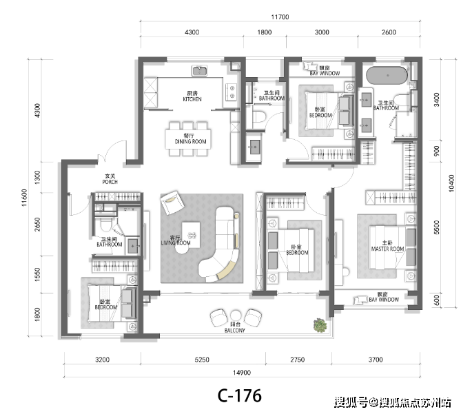 建面约176㎡四房两厅三卫户型: