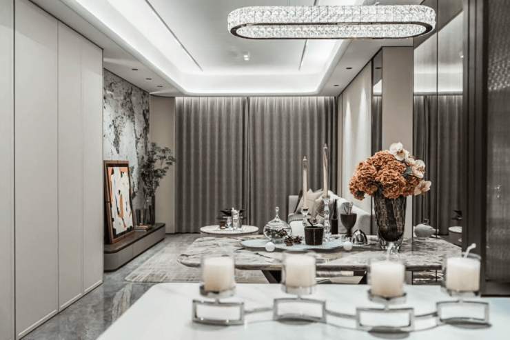 建面约149㎡户型,是此次展示的最大户型,搭配四开间全南向布局,将客厅、主次卧尽揽于阳光丰沛的界面,与整面观景窗搭配,让光线在空间中自由流淌,形成全天候的全景采光带,确保每一扇窗皆为无遮挡的景框,私享通透与静谧的平衡。