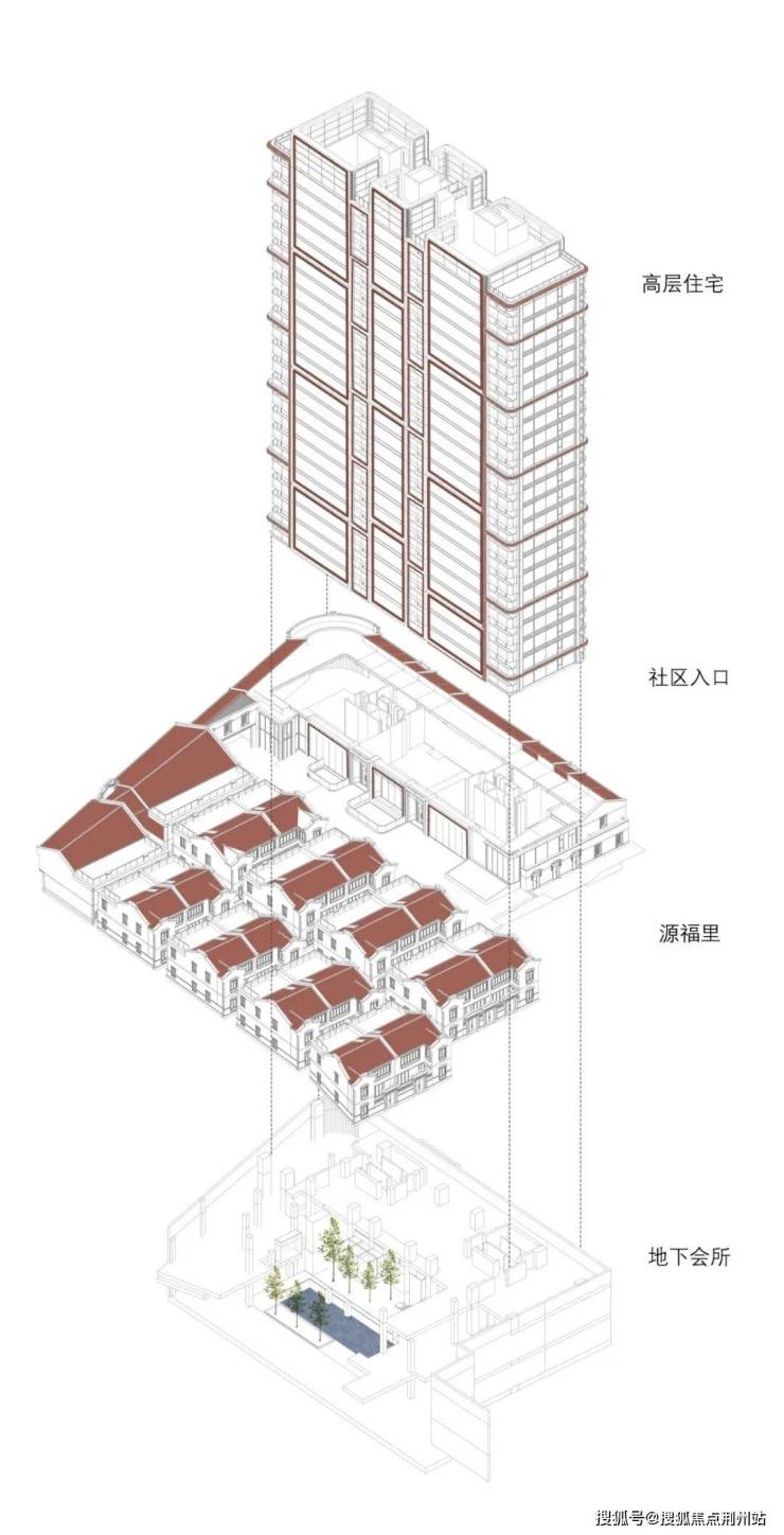 不同于因扩容诉求抹除肌理,或因力求保护而忽略价值,设计延续南北纵向里弄格局,以三类策略介入:最大石库门文保点源福里整体留存,新建组团与景观系统以线性嵌入式织补,形成“新建—保留—织补”交织的共生结构,让低密历史片区持续融入当代城市机能。