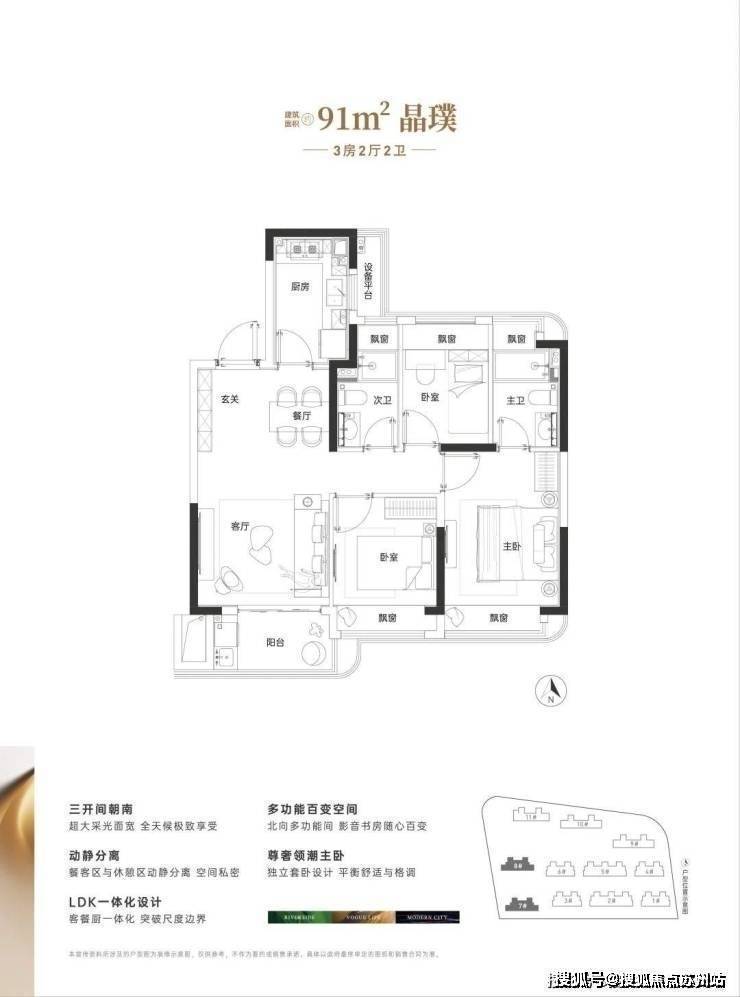 建面约91㎡做3房2卫,三开间朝南、3房5飘窗1阳台,整体室内的采光、视野以及通风都相当出彩。动静分离+主卧套房的设计,保证了整体居住的安静和私密性。