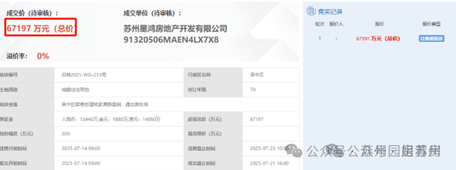 今年7月土拍中,苏州星鸿(星河&天鸿伟业)以总价约6.72亿竞得,成交楼面价14400元/㎡。