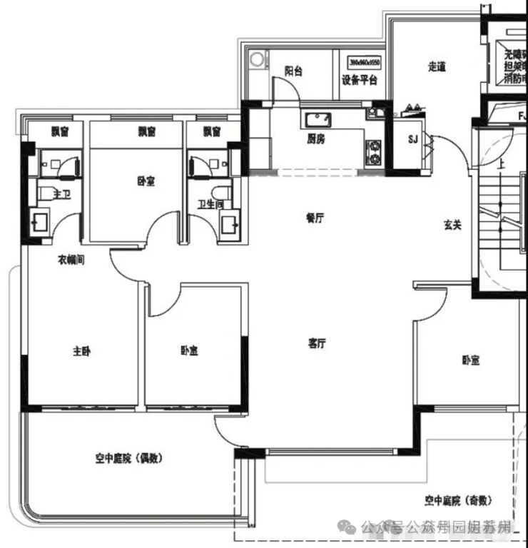 洋房建面约143㎡4房2卫,4开间朝南,整体南向开间约14.5米,客厅开间约5m,主卧套房,北向生活阳台,分奇、偶数层,区别主要在于空中庭院。