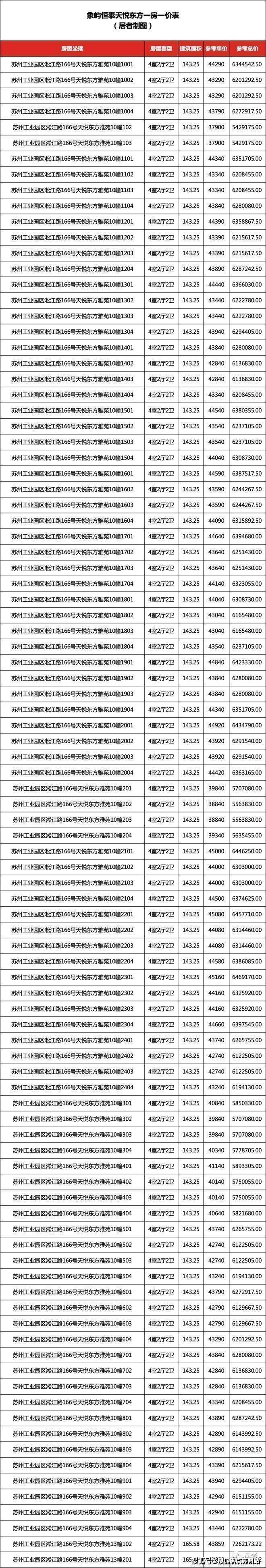 苏州天悦东方一房 一价表:
