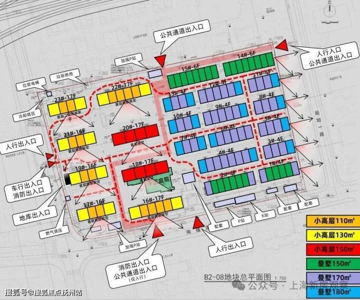 项目将拟建8幢16-17层的高层,在社区的西侧;2幢6F的洋房,以及13幢叠加,分布在了东侧。其中16、19、20、23号楼首层局部架空,18号首层全部架空。还设计了下沉庭院。