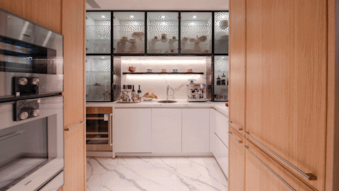 约270度三面环幕式开窗,打通阳台、客厅、餐厅与厨房,形成约19.1米南向与22.1米东向的超宽视野面宽。空间如画轴展开,面朝陆家嘴天际线,营造如剧场般的奢阔视觉感受。