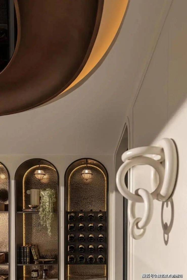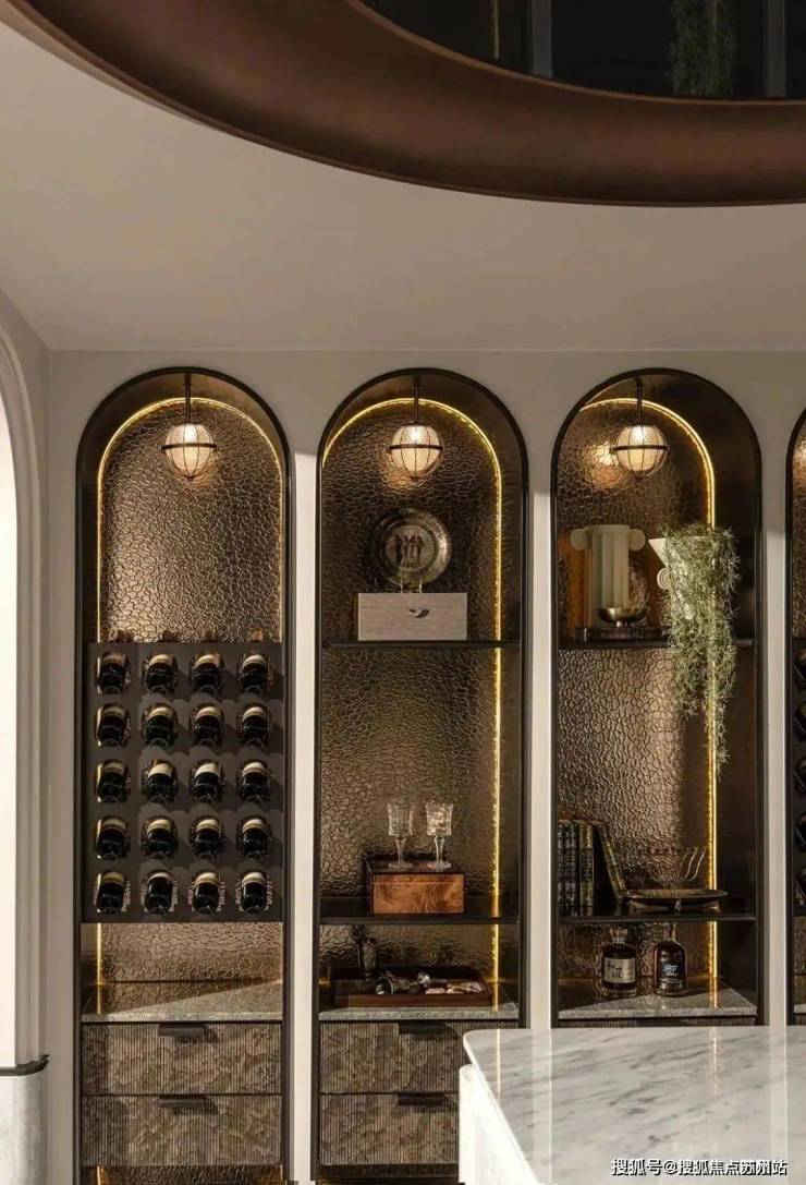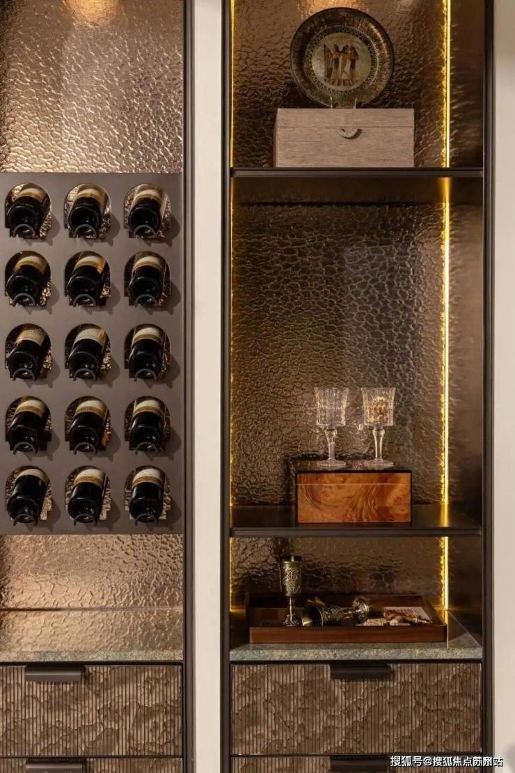 在昏黄而柔和的灯光下,酒柜静伫于宽敞而雅致的厅堂一隅,犹如是时光深处走出的艺术杰作,散发着不言而喻的浪漫与奢华。