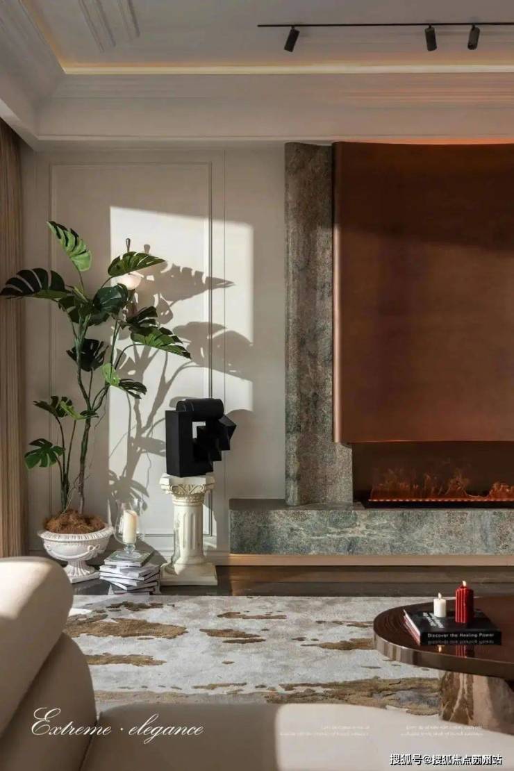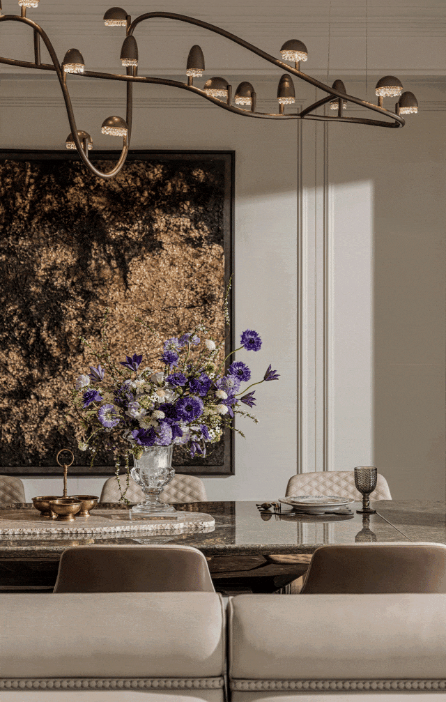 空间被加以留白,墙面淡雅的米白色,家居装饰的焦糖色,搭配着细腻的石膏线条装饰与库里南石,勾勒出古典与现代的完美平衡。