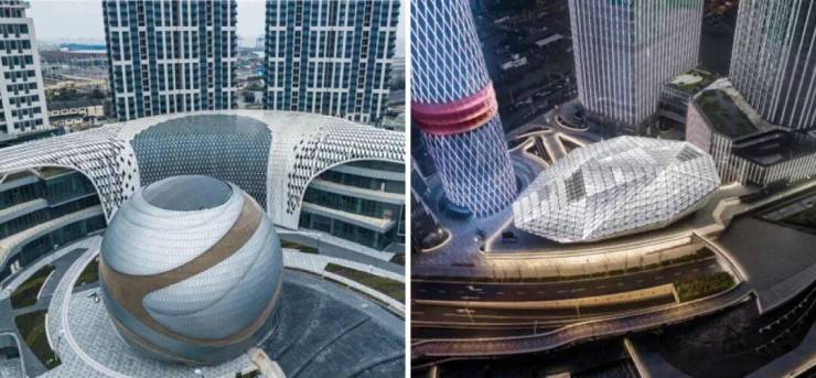 西侧的巨型球体影院,约30米高共三层,可同时容纳约380人观影。