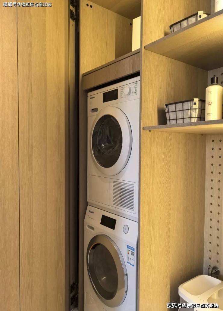 北次卧门外设有一个家政空间,深度超过60厘米,内含洗烘套件及大量收纳空间。采用隐形门设计,既实用又兼具美观。
