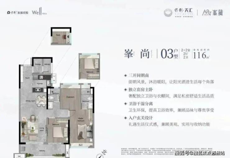 保利天汇项目中还有一款建筑面积约116平方米的四房户型,该户型设计亮点颇多。首先,三开间朝南布局,确保了主卧、次卧以及客厅能够享受到充足的自然采光和良好的通风效果,同时提供有南向和东向两种不同的朝向选择,以满足不同购房者对景观和日照的需求。