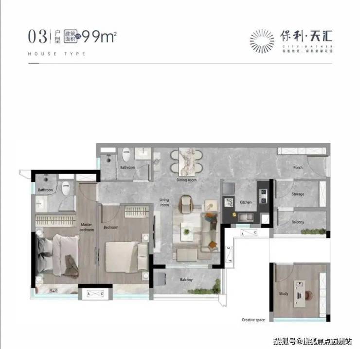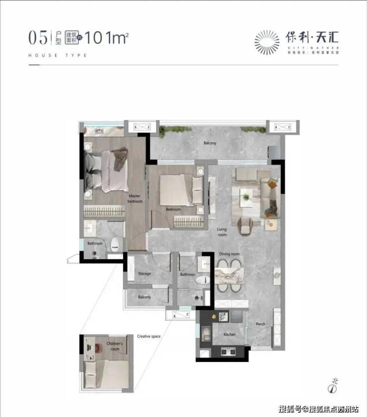 保利天汇项目目前在售的一款建面约101平方米的三房户型,采用经典竖厅设计,有效实现了起居空间与休息区域的动静分离。这一设计不仅优化了居住动线,也保证了家庭成员在日常生活中的私密性及舒适度。