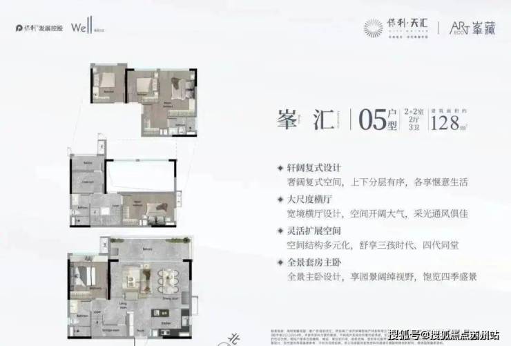 保利天汇的128平米复式四房户型设计非常独特,西北朝向,全景主卧,上下分层有序,保证了居住的私密性和舒适度。同时,该户型拥有三个卫生间,提高了居住的便利性和舒适度。