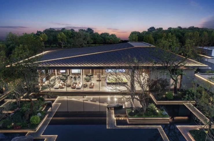 三面铝板外立面+香槟金线条,新中式“三进两轴十二园”园林