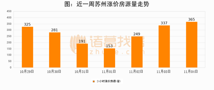 根据诸葛找房数据显示,苏州24小时涨价房源量为365套,较11月03日增加28套,环比上涨8.3%。与此同时,涨价房源占比小幅扩大,业主信心有所提升。