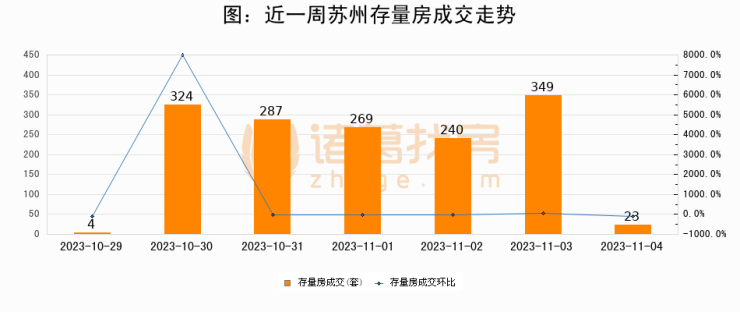 从存量房来看,2023年11月04日苏州存量房单日成交23套,比昨日减少326套,环比下降93.4%。从近一周存量房成交来看,苏州存量房日均成交套数为213套,11月04日单日成交23套,低于近一周平均水平89.2%。