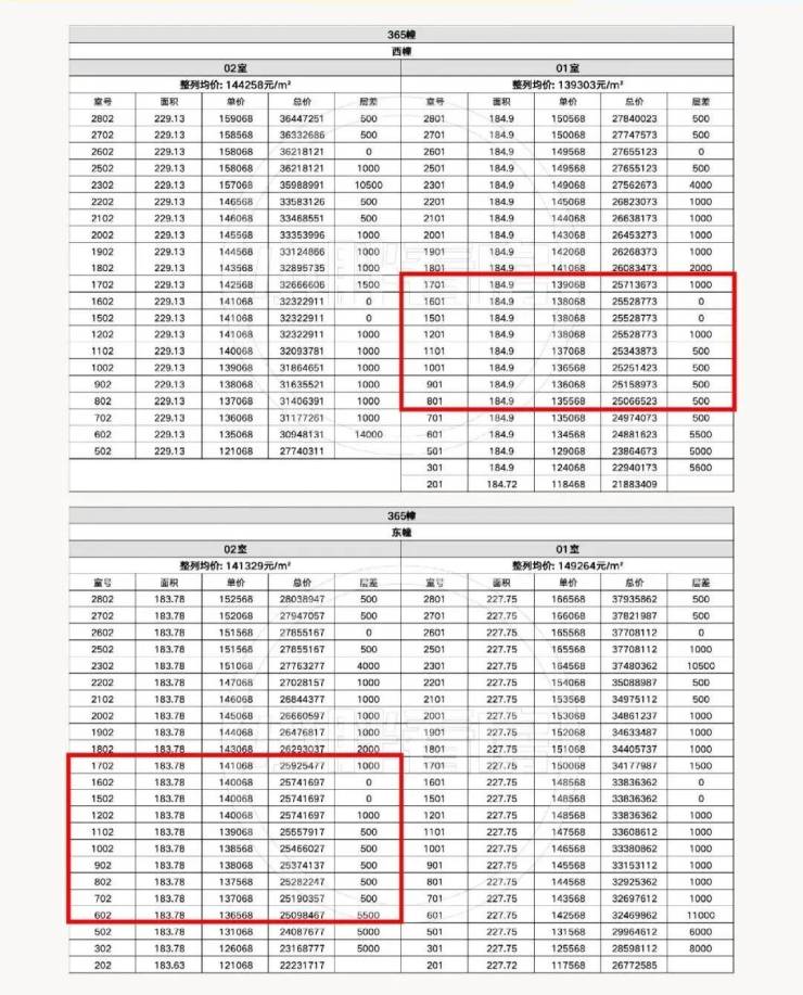 注意看价格表,2500万是项目建面约185㎡的主力价格段,买的都是中间楼层,并非低区。228㎡户型最贵3794万,4千万以内的预算真的是随便选!