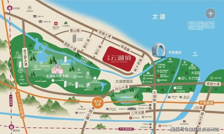 云湖境东侧约300米为南太湖,坐拥一线临湖绝佳地段,揽尽湖山风华。
