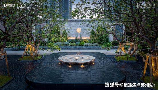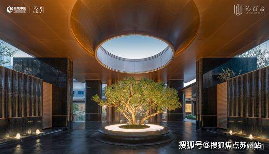 大门内是回廊曲径+中央树池+安哥拉黑整石弧形水景+金属格栅,实景组合形成静谧优雅的光影空间,细节质感历历在目。