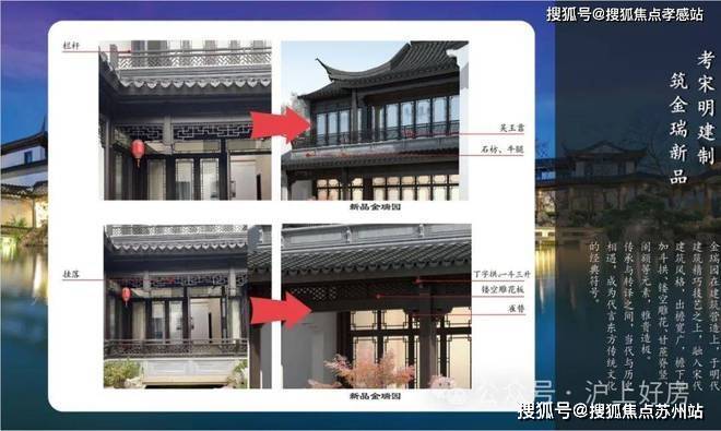 同时,建筑采用宋代宫殿, 建筑出檐宽广,檐下增加斗拱、镂空雕花、甘蔗脊、阑额等元素,约2/3宅园设置入户连廊,为全国之最,雅贵造极。