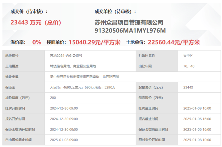 东吴序,即,苏地2024-WG-Z45号地块,位于 吴中经开区长桥街道宝带西路南侧、龙西路西侧,1月8日,吴中建设以底价23443万元竞得, 成交楼面价15040元/平。